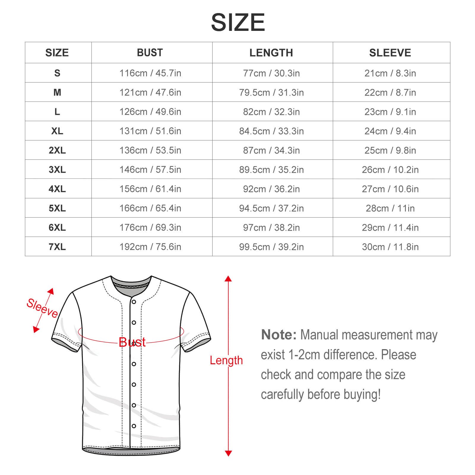 S, M, L, XL, 2XL, 3XL, 4XL, 5XL, 6XL, 7XL